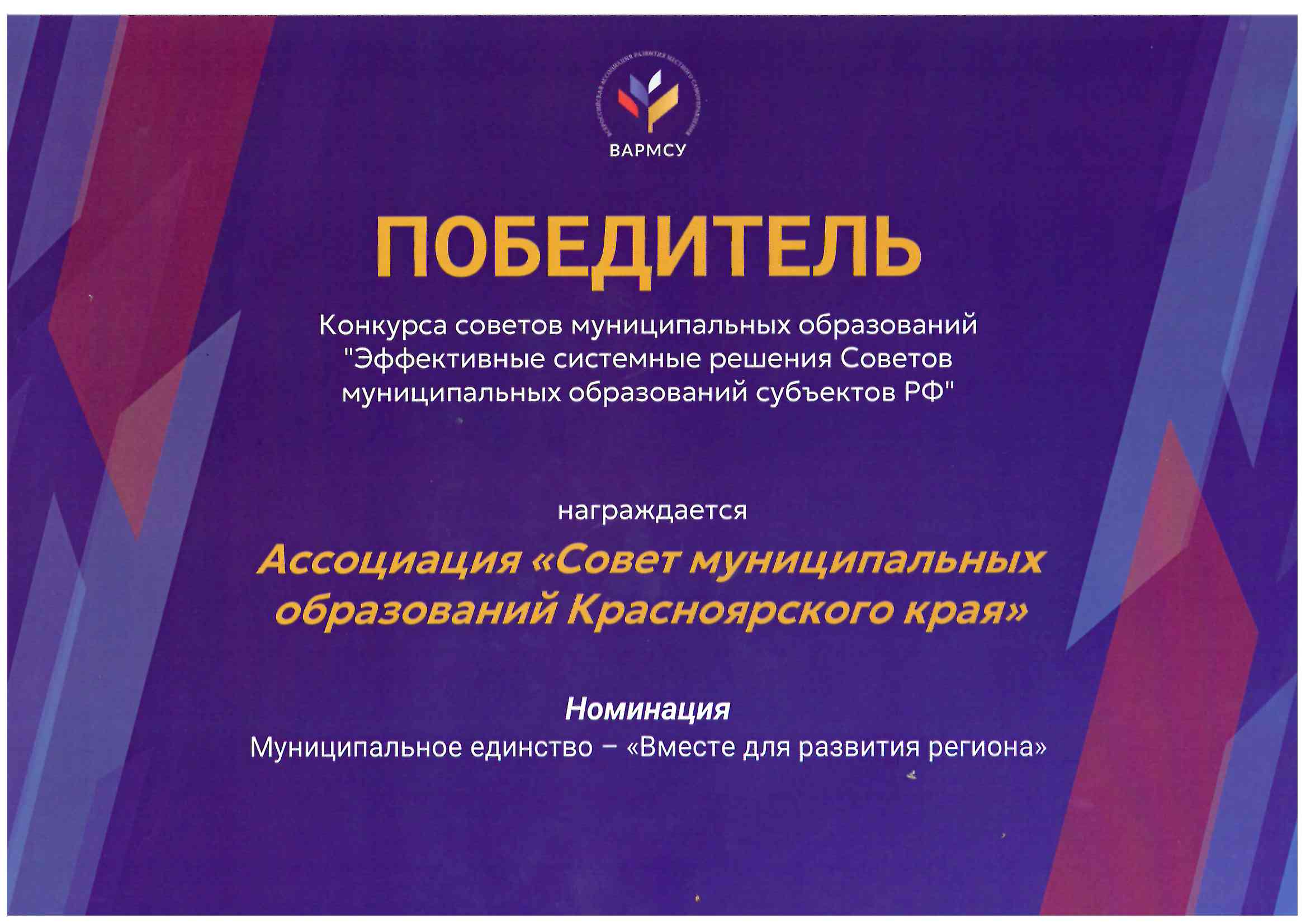 Совет отмечен как победитель Конкурса советов муниципальных образований «Эффективные системные решения Советов муниципальных образований субъектов Российской Федерации».