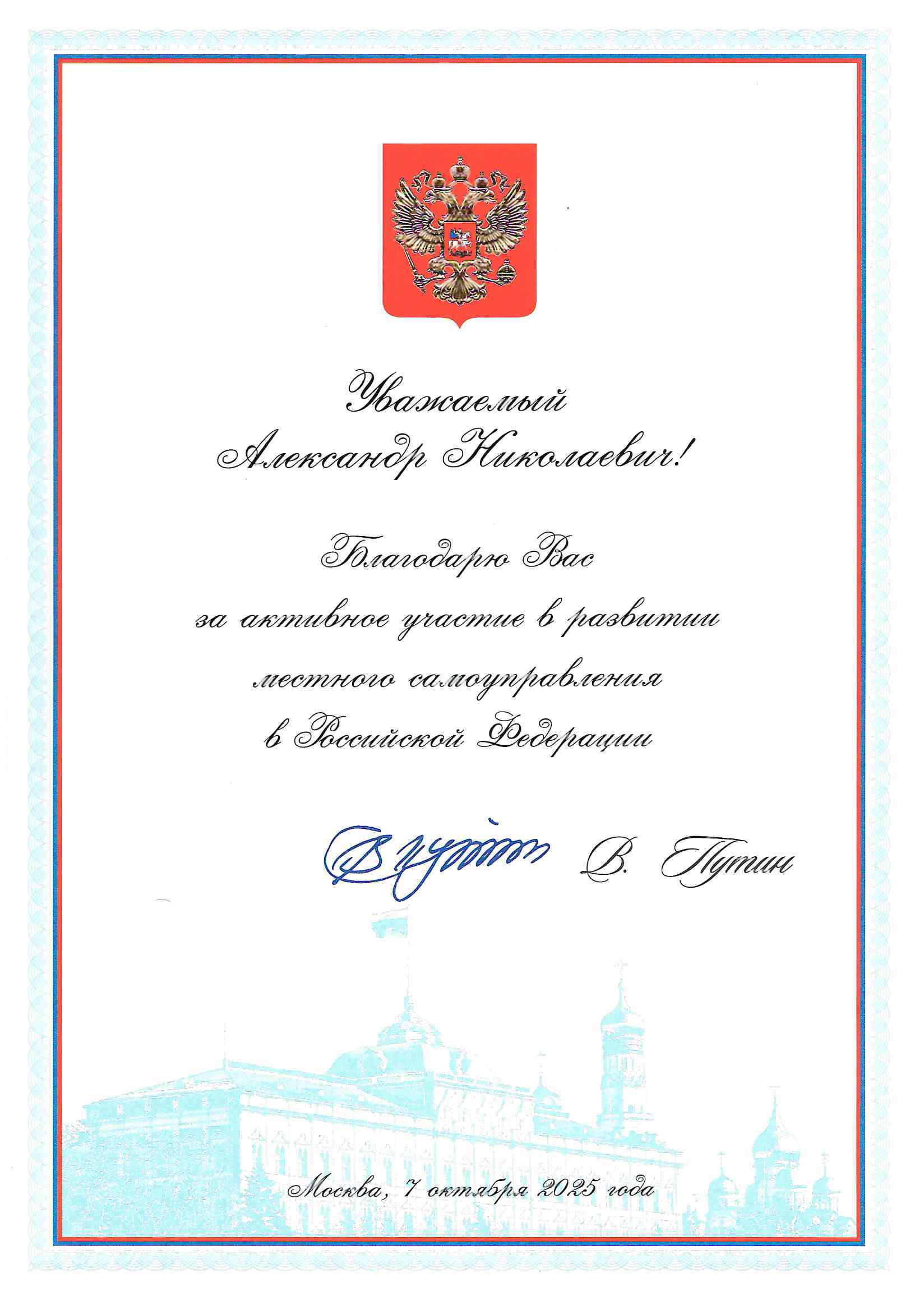 На съезде ВАРМСУ прозвучала ещё одна высокая оценка деятельности Совета муниципальных образований Красноярского края. Александру Коновальцеву, исполнительному директору Совета, вручено Благодарственное письмо Президента РФ Владимира Путина за активное участие в развитии местного самоуправления в Российской Федерации.